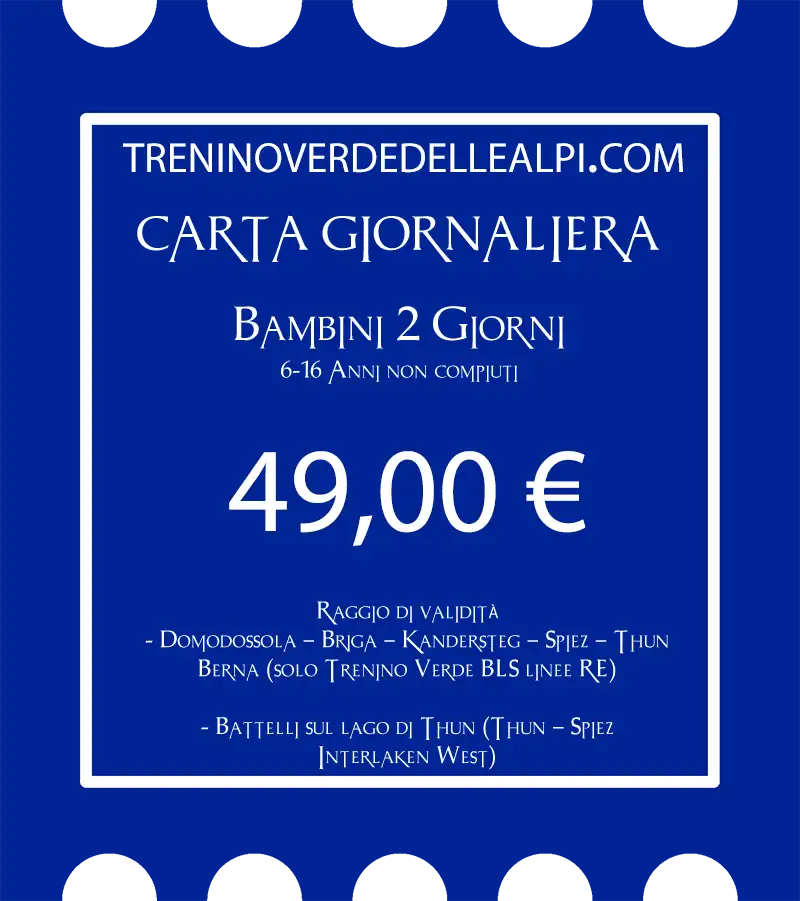 - utilizzo del Trenino verde per 2 giorni sulla tratta domodossola – Berna con possibilità di scendere e salire alle tappe desiderate in ambedue le direzioni